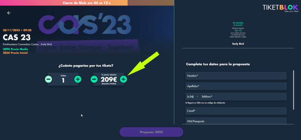 Usa el precio medio del último bloque como referencia para hacer tu propuesta. Piensa que propuestas muy bajas (que no lleguen a cubrir tus propios gastos en la CAS) o propuestas muy altas (por encima del precio de las entradas «Regular» que alterarían mucho el precio promedio) serán rechazadas automáticamente.